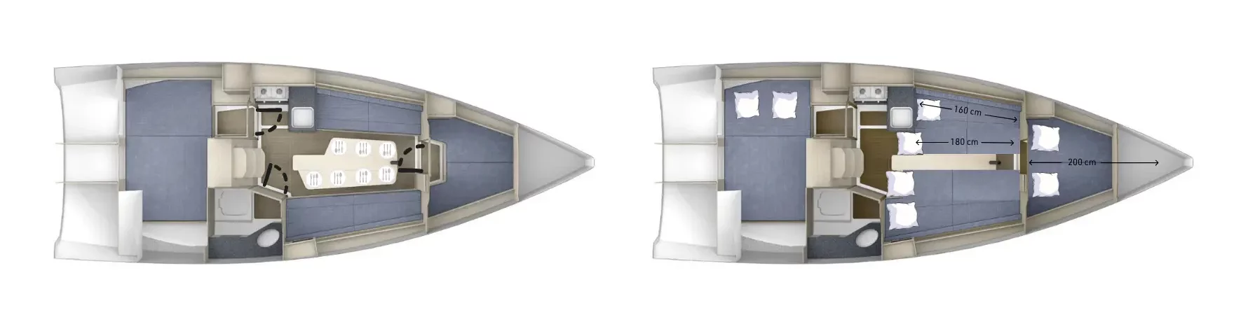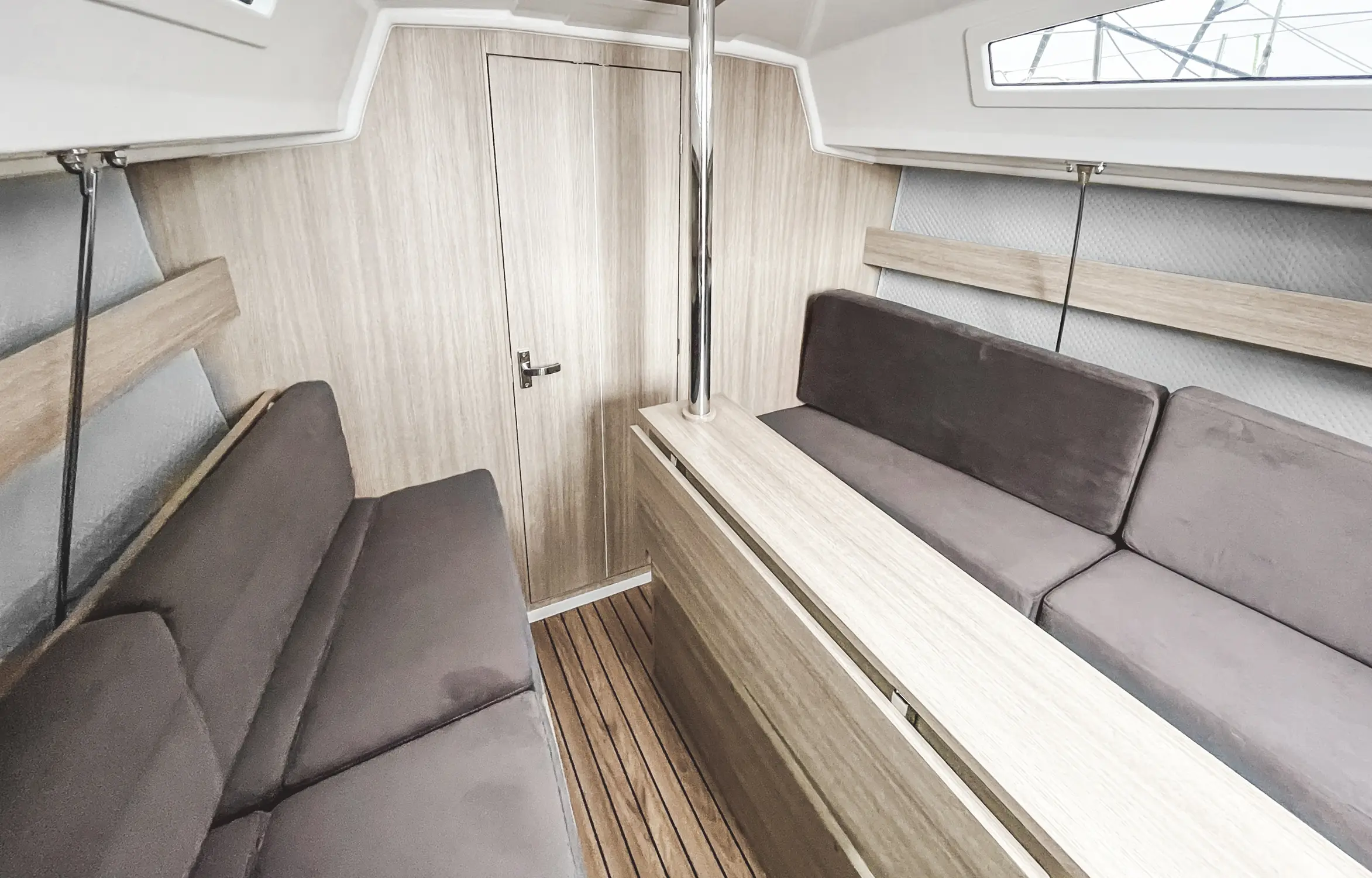 Maxusy Evo 24 to najmniejsze jednostki w naszej flocie. Mimo kompaktowych wymiarów, również można na nich żeglować aż 8 osób. My polecamy te jachty dla załogi 5 osobowej, bo wtedy jest najwygodniej. W kabinie mamy jedną wspólną przestrzeń podzieloną na strefy – można powiedzieć, że to wnętrze typu „open space”.